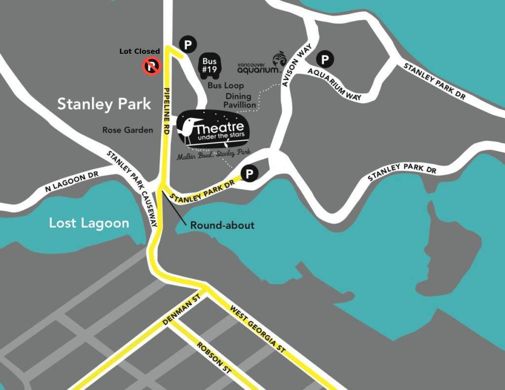 Drive on Georgia Street northbound, towards Stanley Park in the right hand lane. As you enter Stanley Park, you will come up to a round-about. Drive straight through the roundabout, past the Rose Garden sign and take the first right. Theatre signage will be directly in front of you. Continue along past The Stanley Park Dining Pavilion for parking in front of the Stanley Park Train.
